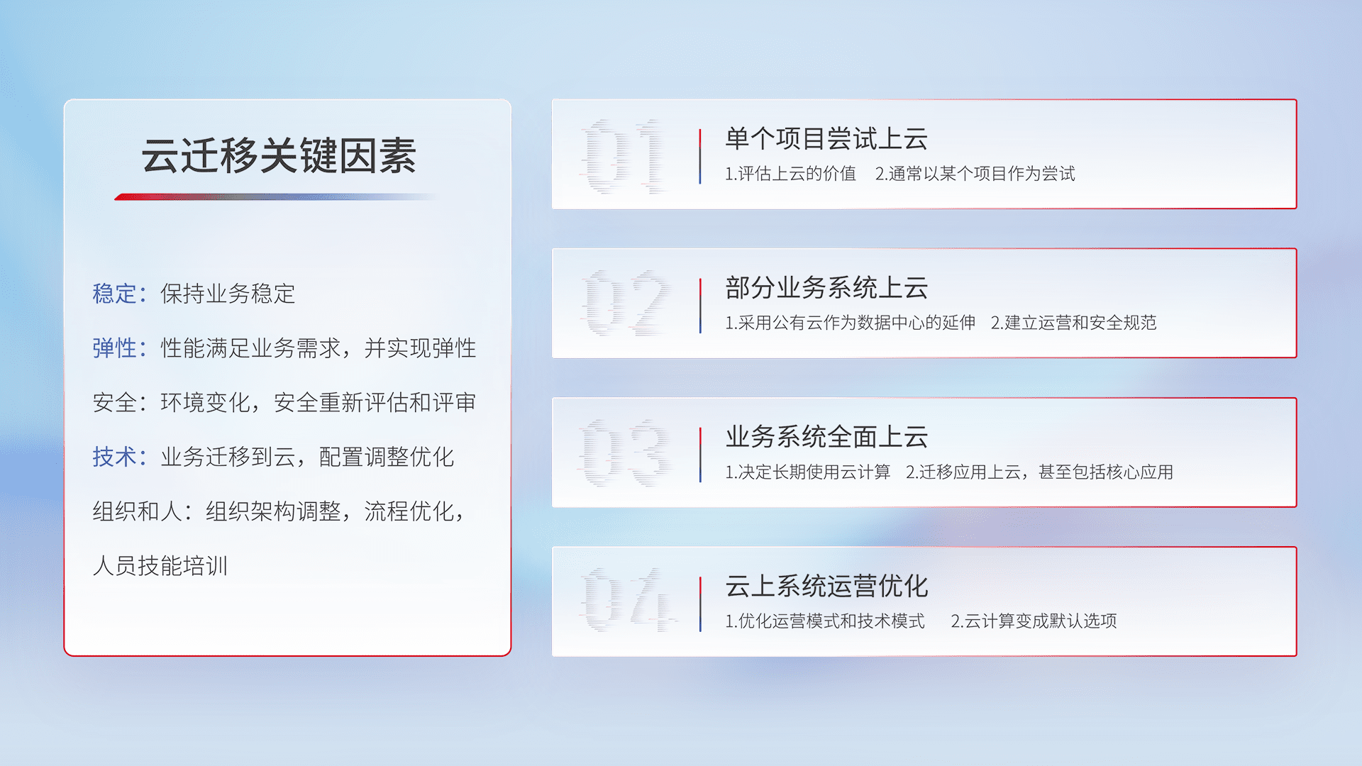 结合实际业务,,从规划设计、、、云平台选型、、、、云原生改造、、、、数据迁移、、、、集成交付,,迁移全过程为客户识别最佳上云路径,,,,做好风险识别管理,,,设计网络架构、、身份权限、、安全审计合规、、操作审计、、、日志审计、、、、监控告警策略、、、、多站点容灾设计等,,,对云上基础设施进行整体规划,,,,提升IT治理水平,,,以满足弹性、、高可用、、、高性能的需求。。。