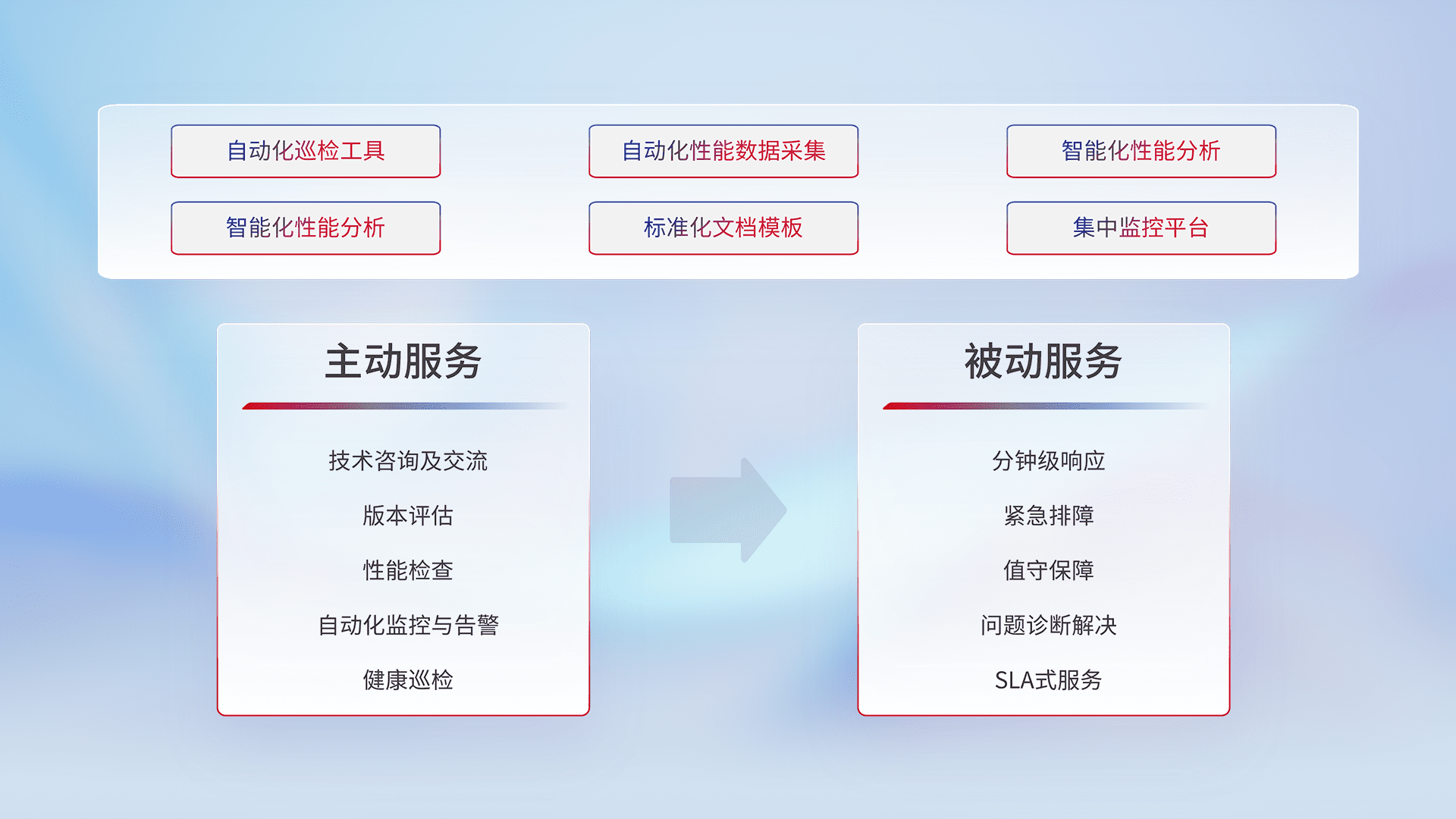 智能化工具和标准化文档,,,,保障服务质量,,,,提供主动服务(包含技术咨询、、、、版本评估、、、、性能检查、、、自动化监控与告警、、、、健康巡检)和被动服务包含(分钟级响应、、紧急排障、、、值守保障、、、、问题诊断解决、、SLA服务)。。。。